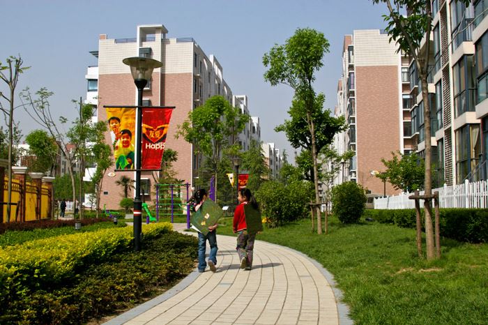 豐富的水系和現(xiàn)代城市景觀相結(jié)合的獨(dú)特的萬象新天情調(diào)商業(yè)內(nèi)街,有著街頭綠地、大型種植、休閑小品、沿街遮陽飄蓬等多種情趣元素,而水體則自由散漫其中。豐富的水體、變化的綠地、多種硬質(zhì)鋪裝和沿街的飄棚、休閑小品等元素的結(jié)合,讓萬象新天的商業(yè)內(nèi)街突出了休閑功能,使其形成了社區(qū)居住者的共享客廳,成為“萬象新天”繼城市空間之后的第一度過渡空間。