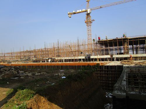 2、萬象城市綜合體水岸香堤1#樓1軸~10軸主體一層鋼筋、模板工程進行施工中。
