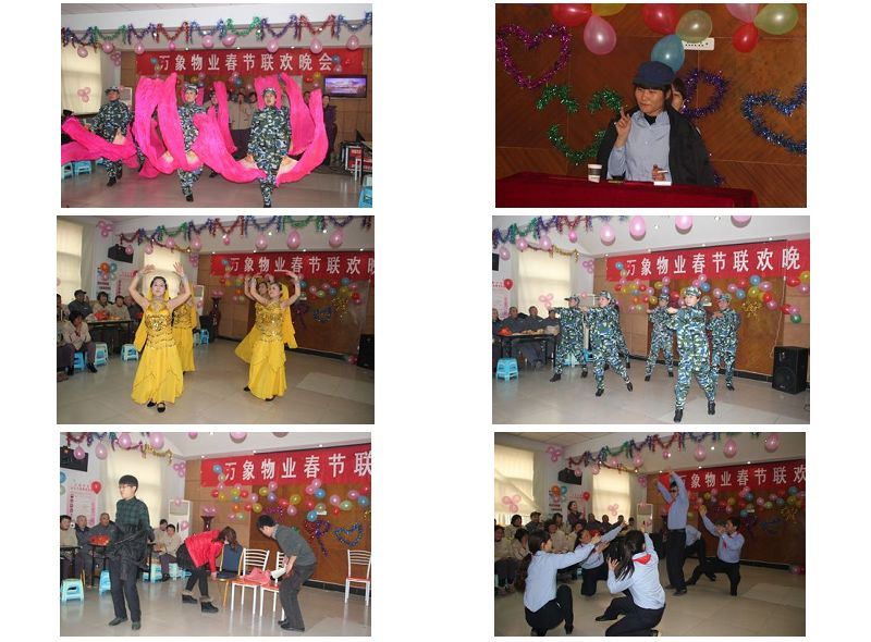 聯(lián)歡活動會現(xiàn)場布置得紅紅火火,熱鬧非凡;顒拥墓(jié)目更是精彩紛呈,目不暇接。手語舞《相親相愛一家人》、三句半《說說咱們的樓道》、獨唱《萬象人》、歌曲《萬象小區(qū)團(tuán)結(jié)的人》、小品《吉祥三寶》和新天工程人員表演的《三句半》,以不同形式展現(xiàn)了萬象物業(yè)公司員工團(tuán)結(jié)協(xié)作、盡心盡力為萬象物業(yè)的發(fā)展付出的辛勤勞動,以及取得的可喜成績;歌曲《一生中最愛》、《小酒窩》、《傳奇》唱出了年輕人對愛情的憧憬和追求,贏得了現(xiàn)場觀眾的陣陣掌聲;由新天公秩部表演的《擒敵拳》,剛勁有力,時代服務(wù)中心表演的《廣播操》新穎別致,展示了員工強(qiáng)健的體魄,奮力向上的精神面貌;新天環(huán)保部保潔班長王喜玲自編的《河南墜子》字字珠璣,道出了萬象物業(yè)人努力拼搏自強(qiáng)不息的精神;由時代服務(wù)中心表演的雙簧《開會》、春天服務(wù)中心表演的啞劇《釘子》,編排富有想象力和創(chuàng)造力,搞笑俏皮的語言、詼諧幽默的動作、夸張給力的表演讓大家笑得前仰后合,更贏得了陣陣掌聲。