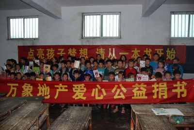 一個半小時的車程,孩子們順利抵達(dá)鄢陵縣南塢鄉(xiāng)劉圪垱小學(xué),校方領(lǐng)導(dǎo)已經(jīng)早早的等候在那里了。工作人員組織孩子們有序下車并分發(fā)雨傘,穿過校園,一行人來到了一排簡陋的教室門前。教室里顯得很黑暗,老舊、殘缺的木桌椅上方,閃亮著一雙雙明亮而又渴望的眼睛?粗晦膱D書擺在課桌上,孩子們情不自禁的發(fā)出一陣陣的歡呼。接著,在萬象地產(chǎn)工作人員和學(xué)校老師的幫助下,兩群孩子們變成了一群,他們坐在一起,讀著同一本書,編織著同一個夢想。