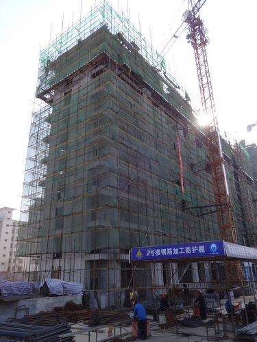 4、萬象藍(lán)天2#樓10層鋼筋綁扎,腳手架搭設(shè)。