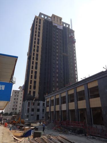 3、萬象藍(lán)天3#樓外墻真石底漆施工。