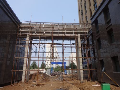 1、萬象藍天1、2#樓南側(cè)混凝土基層施工,北側(cè)圍墻砌筑。大門石材骨架施工。