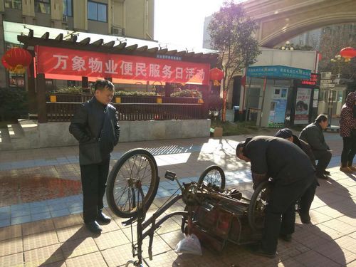 在2017年春節(jié)來臨之際,萬象物業(yè)為感謝廣大業(yè)主朋友多年來對(duì)物業(yè)工作的支持與理解,也為了給業(yè)主朋友們的居家生活提供便利,1月21、22日萬象物業(yè)在春天花園小區(qū)、藍(lán)天花園小區(qū)同時(shí)組織開展了便民服務(wù)活動(dòng),包括:免費(fèi)為業(yè)主維修電動(dòng)車、自行車,免費(fèi)維修小家電,免費(fèi)理發(fā),免費(fèi)磨刀、磨剪子等。天氣雖然較冷,但是依然抵擋不住業(yè)主朋友們參與活動(dòng)的積極性,業(yè)主朋友們對(duì)此活動(dòng)的及時(shí)開展更是好評(píng)如潮.