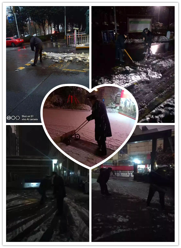 夜?jié)u深,風(fēng)雪肆虐,人們還在熟睡時(shí),保安人員就已連夜清掃路面積雪,保障人們安全出行。