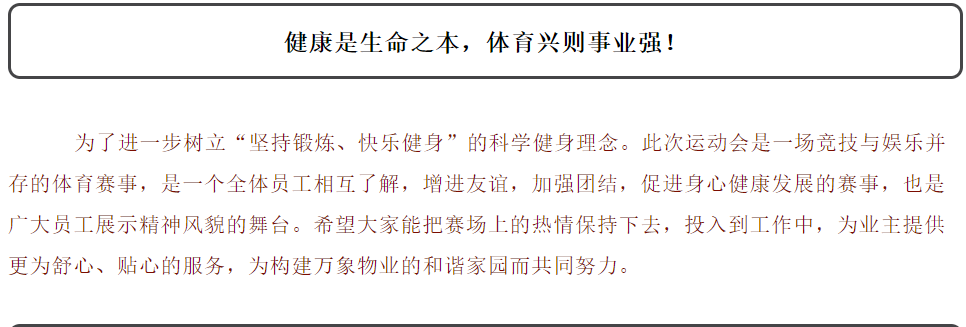 為樹立榜樣力量,豐富員工業(yè)余活動,增強員工之間的凝聚力,營造積極、團結(jié)、和諧、健康的公司文化氛圍,2020年10月30日萬象物業(yè)舉行了優(yōu)秀員工表彰大會和一場關(guān)于“團隊協(xié)作精神力量”的秋季運動會。