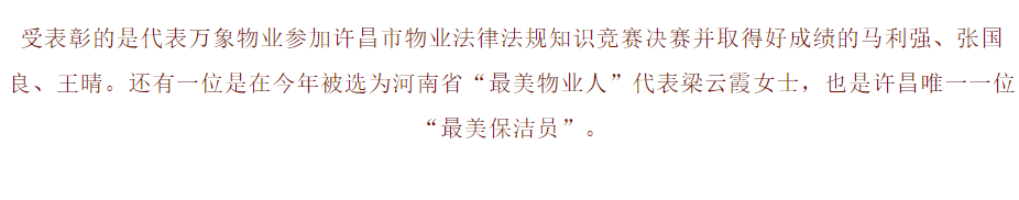 彰的是代表萬象物業(yè)參加許昌市物業(yè)法律法規(guī)知識競賽決賽并取得好成績的馬利強、張國良、王晴。還有一位是在今年被選為河南省“最美物業(yè)人”代表梁云霞女士,也是許昌唯一一位“最美保潔員”。
