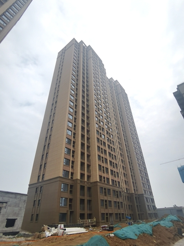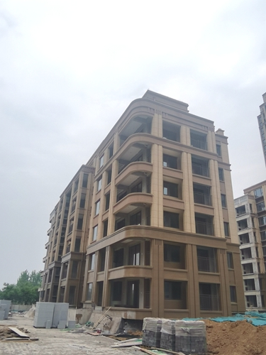 2#樓南側(cè)車(chē)庫(kù)景觀地形整理,道路鋪碎石澆筑混凝土,外墻真石漆施工。