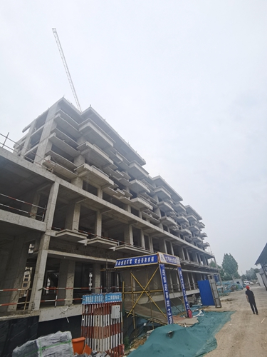 5#樓南側(cè)車(chē)庫(kù)封頂,物業(yè)用房一層搭設(shè)滿堂架,綁扎墻柱鋼筋。