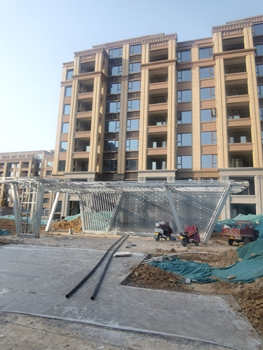 8#樓外墻真石漆施工,正在施工門廳石材鋼架。