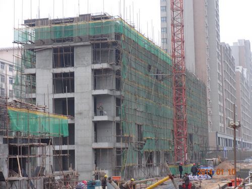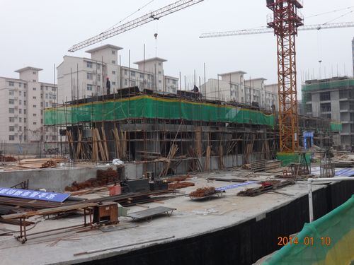 1、萬象藍天1#樓六層梁板柱墻鋼筋綁扎,模板安裝。