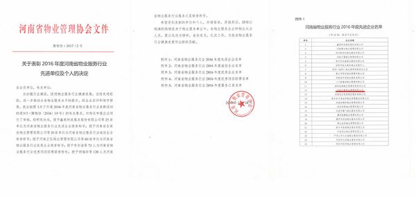 新年第三喜:1月18日,為加強行業(yè)建設(shè),促進物業(yè)服務(wù)行業(yè)健康發(fā)展,總結(jié)先進經(jīng)驗,進一步推動全省物業(yè)服務(wù)水平的提升,河南省物業(yè)管理協(xié)會按照《關(guān)于開展2016年度河南省物業(yè)服務(wù)行業(yè)表彰活動的通知》(豫物協(xié)[2016]19號)的有關(guān)要求,對全省的物業(yè)服務(wù)企業(yè)進行了審核評定,河南萬象物業(yè)公司被評定為“河南省物業(yè)服務(wù)行業(yè)先進企業(yè)”。