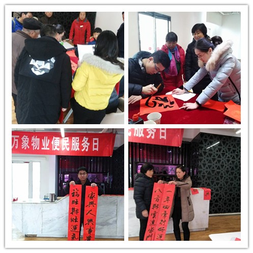春節(jié)臨近之際,萬象物業(yè)為答謝廣大業(yè)主的支持與厚愛,讓業(yè)主能夠度過一個舒適、溫馨的節(jié)日,2月3日至2月4日萬象物業(yè)分別在藍(lán)天花園、春天花園開展了為期2天的便民服務(wù)日活動。為業(yè)主準(zhǔn)備了磨菜刀、小家電維修、熨燙衣物、理發(fā)、寫對聯(lián)等便民服務(wù)項目,讓廣大業(yè)主足不出園區(qū)就能享受到來自萬象物業(yè)的關(guān)懷與便捷。