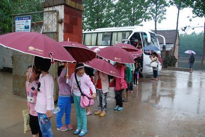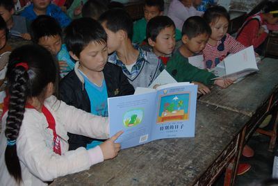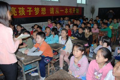 一個半小時的車程,孩子們順利抵達(dá)鄢陵縣南塢鄉(xiāng)劉圪垱小學(xué),校方領(lǐng)導(dǎo)已經(jīng)早早的等候在那里了。工作人員組織孩子們有序下車并分發(fā)雨傘,穿過校園,一行人來到了一排簡陋的教室門前。教室里顯得很黑暗,老舊、殘缺的木桌椅上方,閃亮著一雙雙明亮而又渴望的眼睛?粗晦膱D書擺在課桌上,孩子們情不自禁的發(fā)出一陣陣的歡呼。接著,在萬象地產(chǎn)工作人員和學(xué)校老師的幫助下,兩群孩子們變成了一群,他們坐在一起,讀著同一本書,編織著同一個夢想。