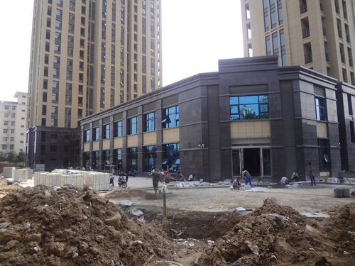 1、萬象藍天2#樓南側、商鋪東側石材鋪裝,大門石材施工。