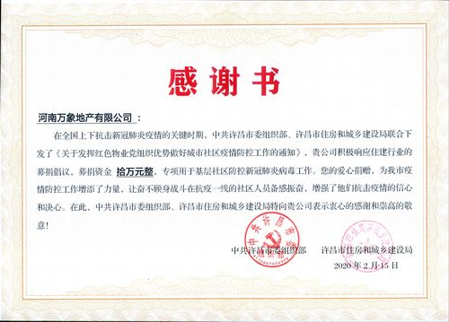 在全國(guó)上下抗擊新冠肺炎疫情的關(guān)鍵時(shí)期,中共許昌市委組織部、許昌市住房和城鄉(xiāng)建設(shè)局聯(lián)合下發(fā)了《關(guān)于發(fā)揮紅色物業(yè)黨組織優(yōu)勢(shì)做好城市社區(qū)疫情防控工作的通知》,我公司積極響應(yīng)住建行業(yè)的募捐倡議,募捐資金10萬(wàn)元整,專項(xiàng)用于基層社區(qū)防控新冠肺炎病毒工作。為我市疫情防控工作增添了力量,受到政府和級(jí)層抗疫工作人員的由衷感謝。