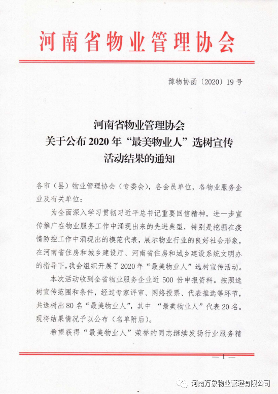 在河南省物業(yè)管理協(xié)會(huì)舉辦2020年“美麗物業(yè)人”選樹(shù)宣傳活動(dòng)