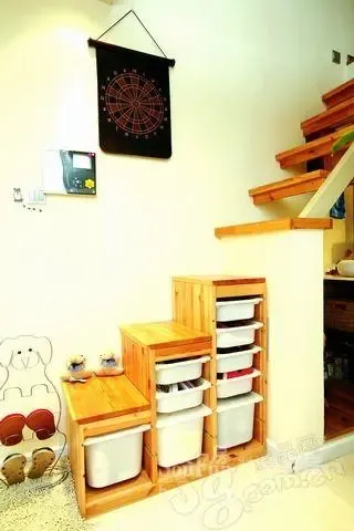 不足五平米的小地臺,內(nèi)部架上了十字型的鋼結(jié)構(gòu),表面鋪了實木地板。在鋼結(jié)構(gòu)中間的空心部分,設(shè)置了抽屜用來儲物。閣樓的階梯也可以利用來收納,在木質(zhì)鞋柜的頂部釘上木板之后,加強其穩(wěn)固感之后便能用做樓梯了。樓梯與鞋柜合二為一,還能節(jié)省空間。